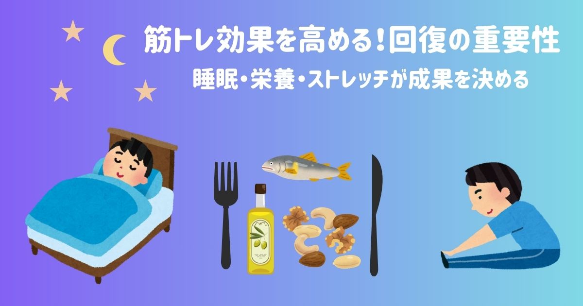 筋トレやダイエットで成果を出すために、多くの人は「どんなメニューをこなすか」「どのくらい追い込むか」に意識を向けがちです。しかし実際には、筋肉はトレーニング中ではなく休息中に成長することをご存じでしょうか。睡眠やケアをおろそかにすると、思うように体が変わらないどころか、疲労やケガの原因にもなってしまいます。本記事では、40代以降の中年男性に特に大切な「回復」に焦点を当て、睡眠・ストレッチ・栄養補給といったケア方法を具体的に解説します。正しい休養を取り入れて、筋トレ効果を最大限に高めましょう。